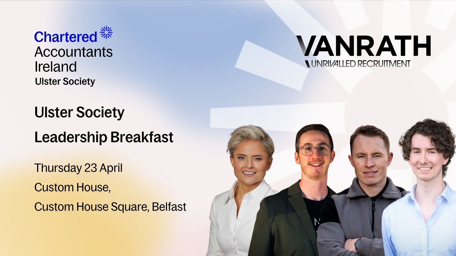 Join us for a dynamic Leadership Breakfast in partnership with VANRATH exploring this year’s theme: Innovation. Speakers include: Oonagh O’Reilly (MOC Performance), Peter McAuley (Nomadic Watches Belfast), Peter Gilleece (Vikela Armour), JB Dobbins (Demanu)